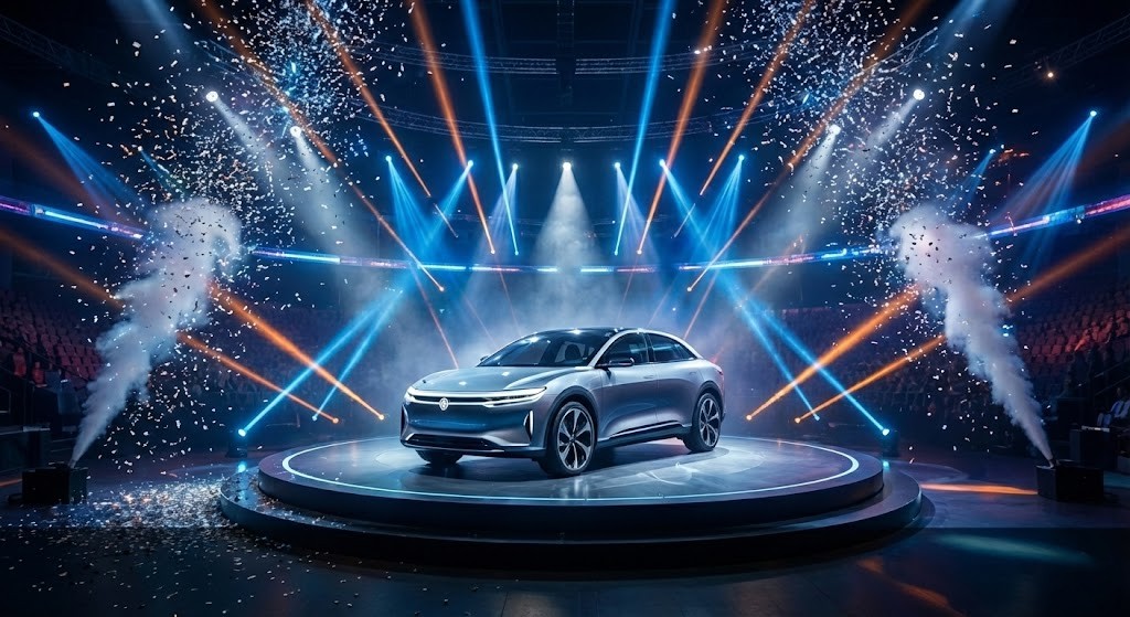 Professional lighting, LED screens, sound systems, and special effects for a dynamic reveal.